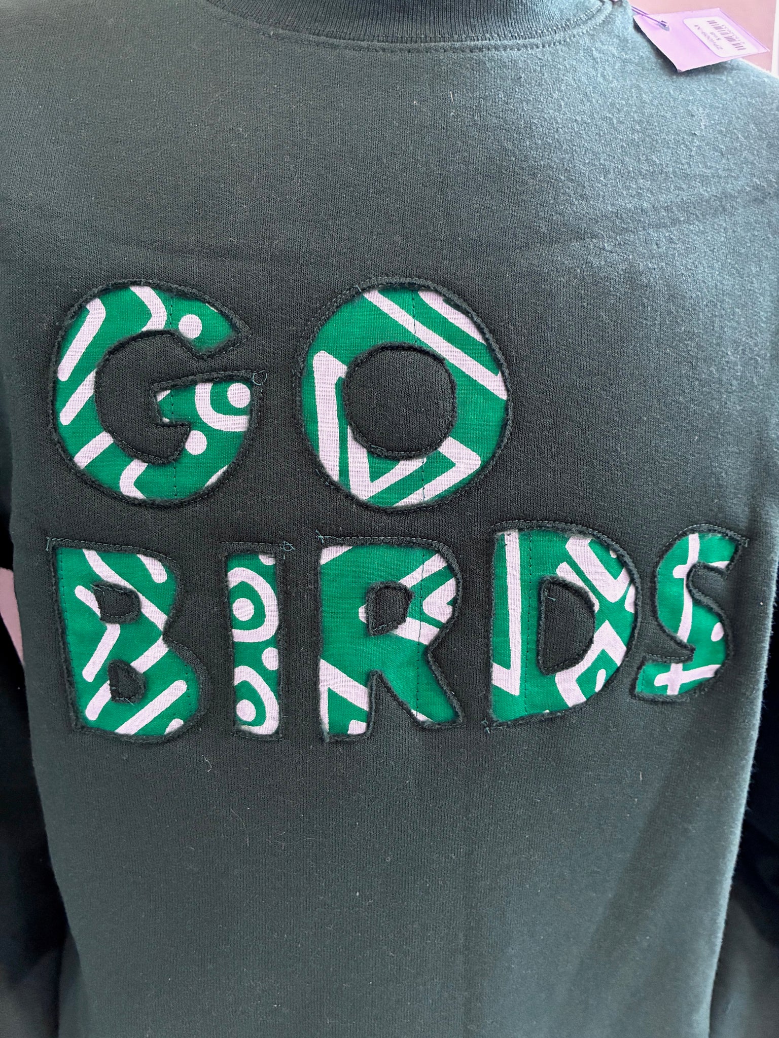 This super-soft unisex sized dark green sweatshirt has "Go Birds" in script, quilted on the front. It is made with the reverse applique technique, meaning there are raw edges on the front and a quilted rectangular piece on the inside.